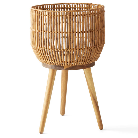 13 in round Brown Resin Planter & Stand Set with Wood Legs, 21.65 in Height