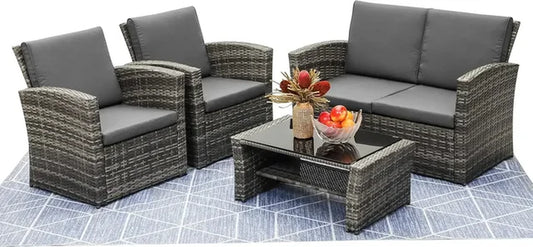 4 Piece Patio Furniture Set, Outdoor Wicker Conversation Set with Glass Top Coffee Table, Outdoor Patio Furniture Sets