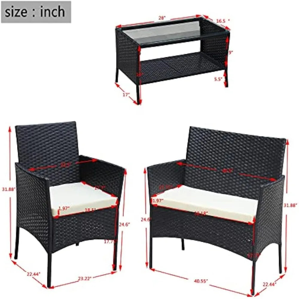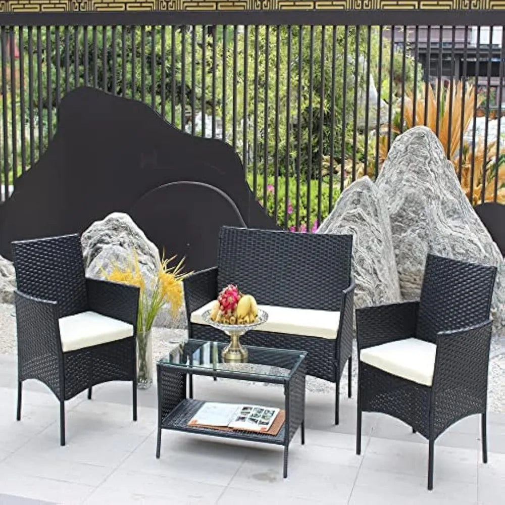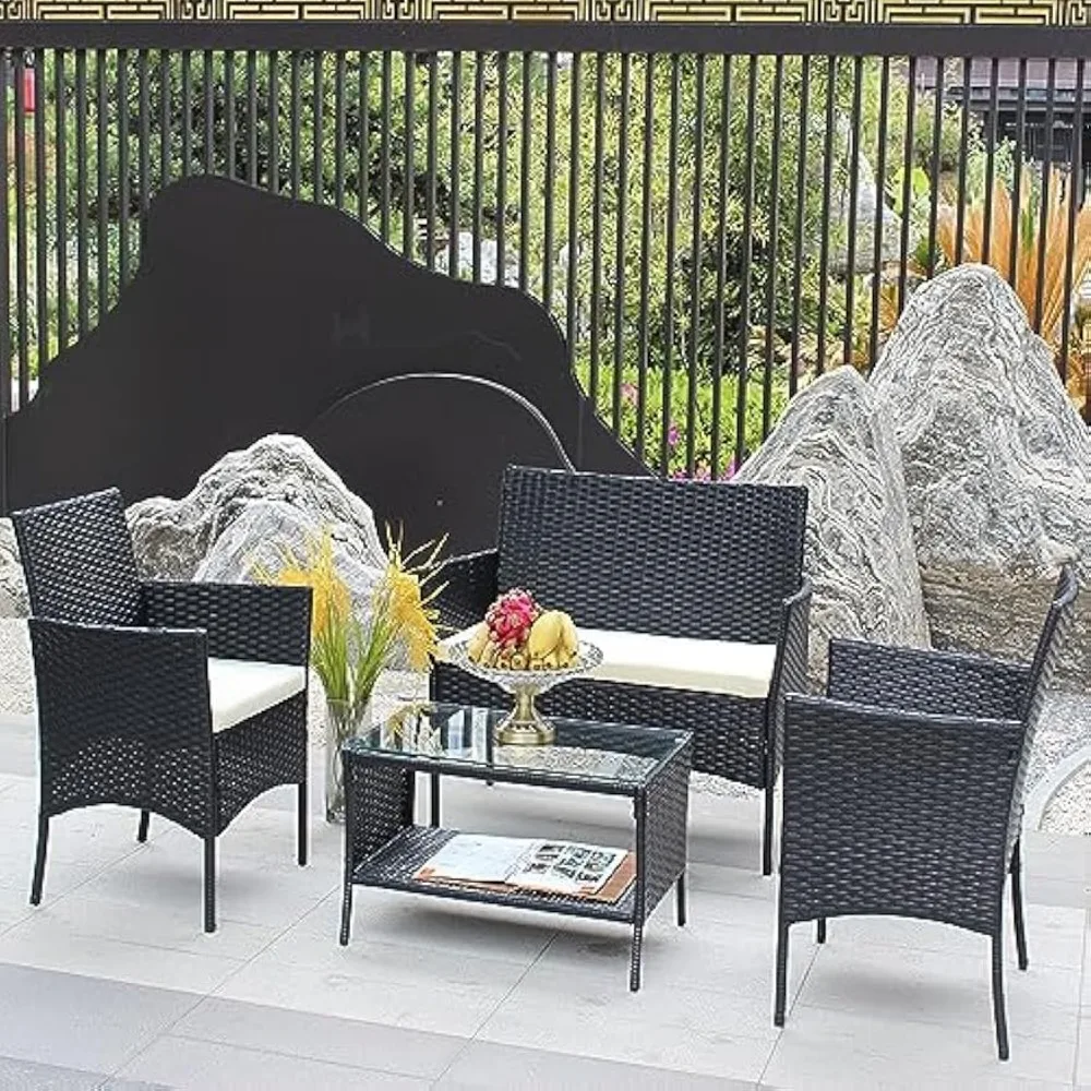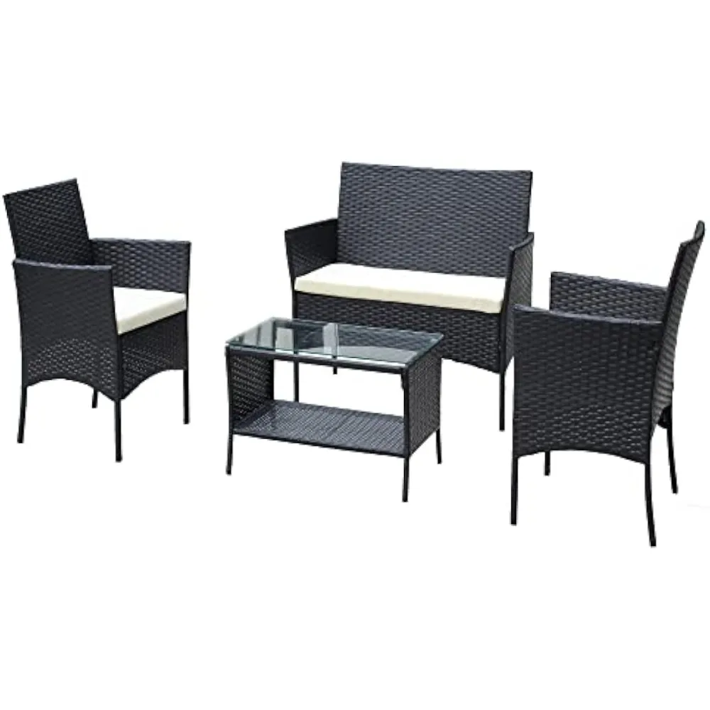4 Piece Outdoor, Small Wicker Patio Conversation Furniture Rattan Chair Set with Tempered Glass Coffee Table for Backyard Porch