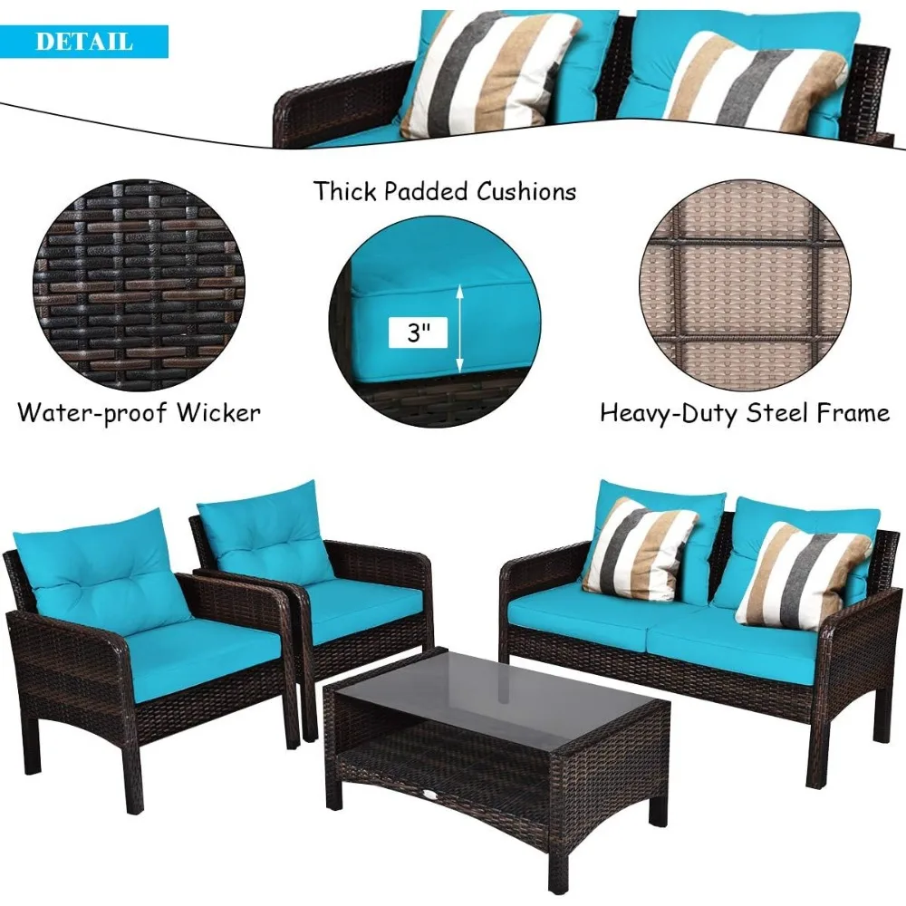 4 Piece Patio Furniture Set, Outdoor Wicker Conversation Set with Glass Top Coffee Table, Outdoor Patio Furniture Sets