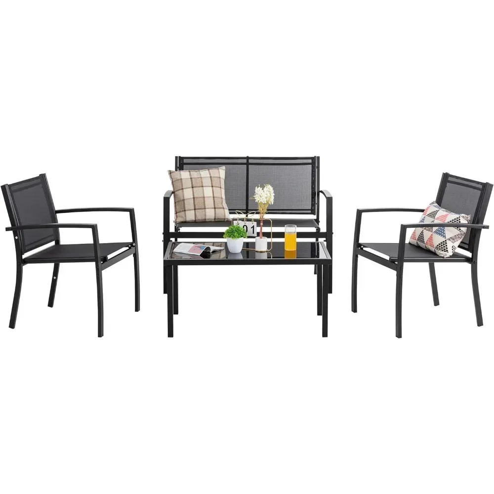 4 Pieces Patio Furniture Set All Weather Textile Fabric Outdoor,Glass Coffee Table,2 Single Chairs Black Garden Furniture Sets